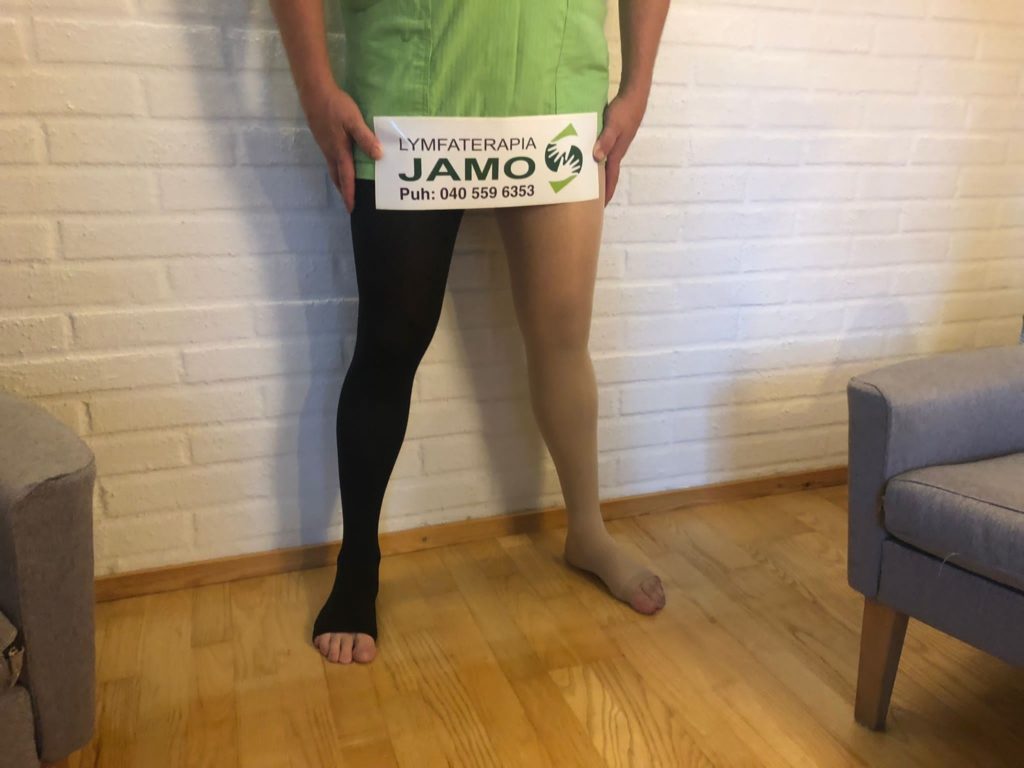 Käytän hoitotukisukkia lymfaterapian tukena tehostamaan hoitoa, mittaan ja arvioin, mitkä sukat olisivat parhaimmat asiakkaan tarpeisiin. Apuvälineillä pystytään helpottamaan sukkien laittoa.